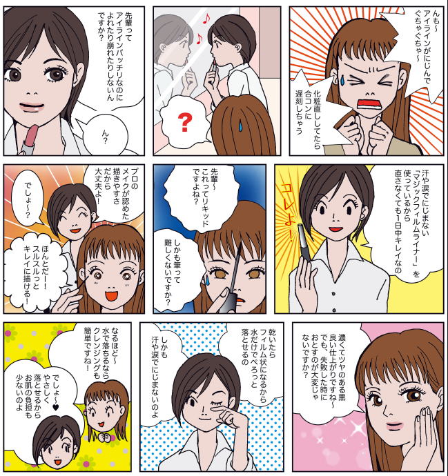 マジックフィルムライナーは“空気と反応して液体がフィルム化する”最新のテクノロジーで開発され、速乾性に優れています。だから、にじんだり、流れたりといった、従来のリキッドタイプとは違う、新ジャンルのアイライナーです。